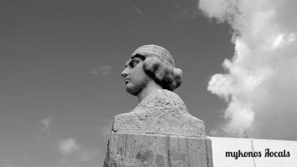 Η προτομή της Μαντώς Μαυρογένους στην ομώνυμη πλατεία στον Γιαλό της Μυκόνου.