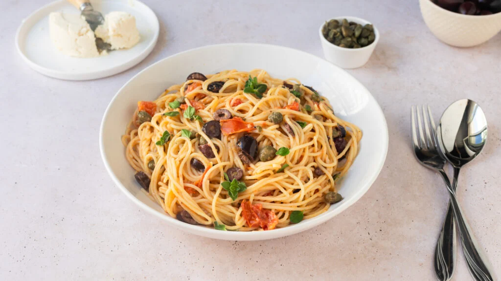 - 500 γρ. Σπαγγετίνη νουμερο 10 Σε ένα μεγάλο τηγάνι ζεσταίνουμε το ελαιόλαδο σε μέτρια φωτιά, και προσθέτουμε τις ντομάτες, την κάπαρη και τις ελιές. Φέρνουμε σε βρασμό και έπειτα χαμηλώνουμε τη φωτιά. Προσθέτουμε φρεσκοτριμμένο μαύρο πιπέρι και σιγοβράζουμε για 15-20 λεπτά. Δέκα λεπτά πριν να είναι έτοιμη η σάλτσα ετοιμάζουμε τα ζυμαρικά μας. Γεμίζουμε μια μεγάλη κατσαρόλα με 5 λίτρα νερό και την βάζουμε σε υψηλή φωτιά. Μόλις το νερό αρχίσει να βράζει, προσθέτουμε 35 γρ. αλάτι και ρίχνουμε τη σπαγγετίνη. Ανακατεύουμε και αφήνουμε να βράσουν για όσο χρόνο αναφέρει η συσκευασία μείον 1 λεπτό. Πριν τα στραγγίσουμε κρατάμε στην άκρη 1 κούπα από το νερό που έβρασαν τα ζυμαρικά σε περίπτωση που χρειαστεί. Προσθέτουμε στο τηγάνι με τη σάλτσα 1/2 κούπα από το νερό που έβρασαν τα ζυμαρικά για να δέσει η σάλτσα και ανακατεύουμε καλά. Βράζουμε για 1-2 λεπτά. Στραγγίζουμε τη σπαγγετίνη και τα προσθέτουμε στο τηγάνι. Προσθέτουμε την κοπανιστή Μυκόνου και ανακατεύουμε πολύ καλά. Αν χρειαστεί προσθέτουμε λίγο ακόμα από το νερό που έβρασαν τα ζυμαρικά. Προσθέτουμε φρεσκοτριμμένο μαύρο πιπέρι και σερβίρουμε αμέσως.Σπαγγετίνη με κάπαρη, ελιές και κοπανιστή Μυκόνου